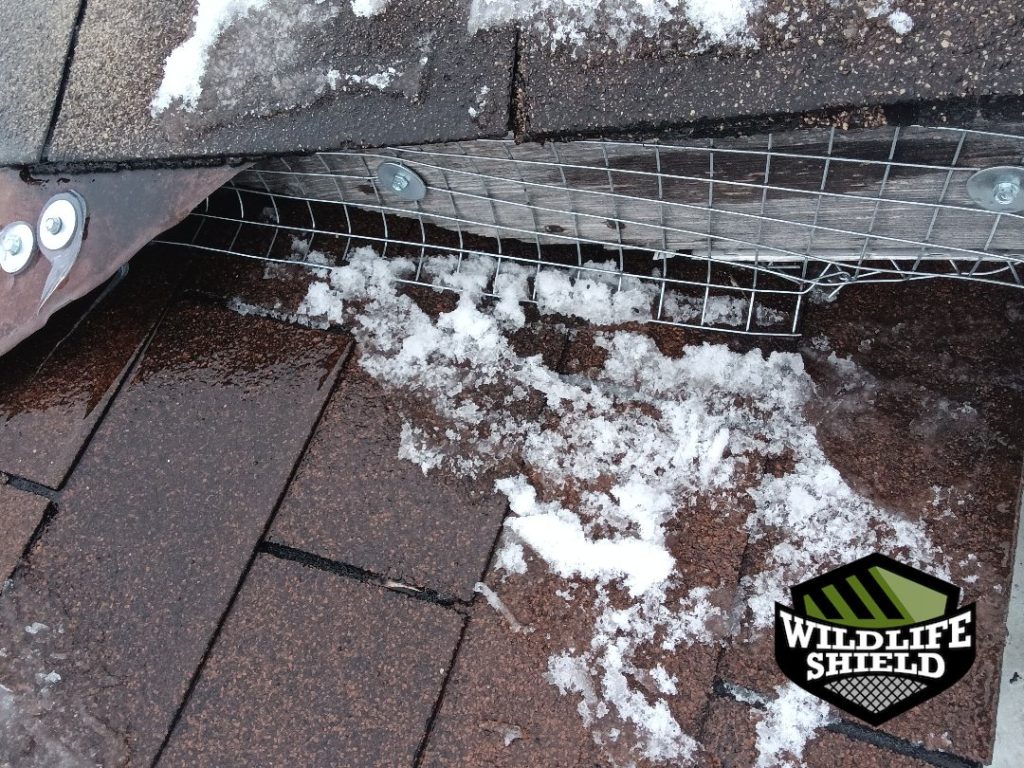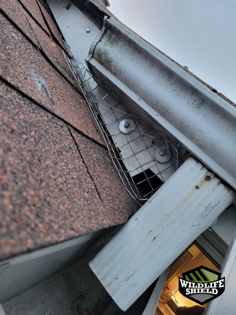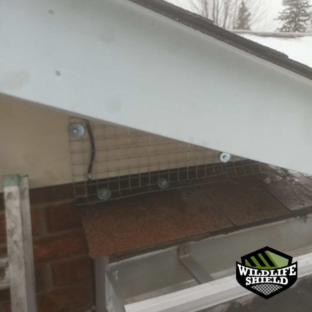 Photos taken during service show steel screening fastened along soffit edges and roofline intersections, with mesh contoured to fit beneath shingles and fascia where required.